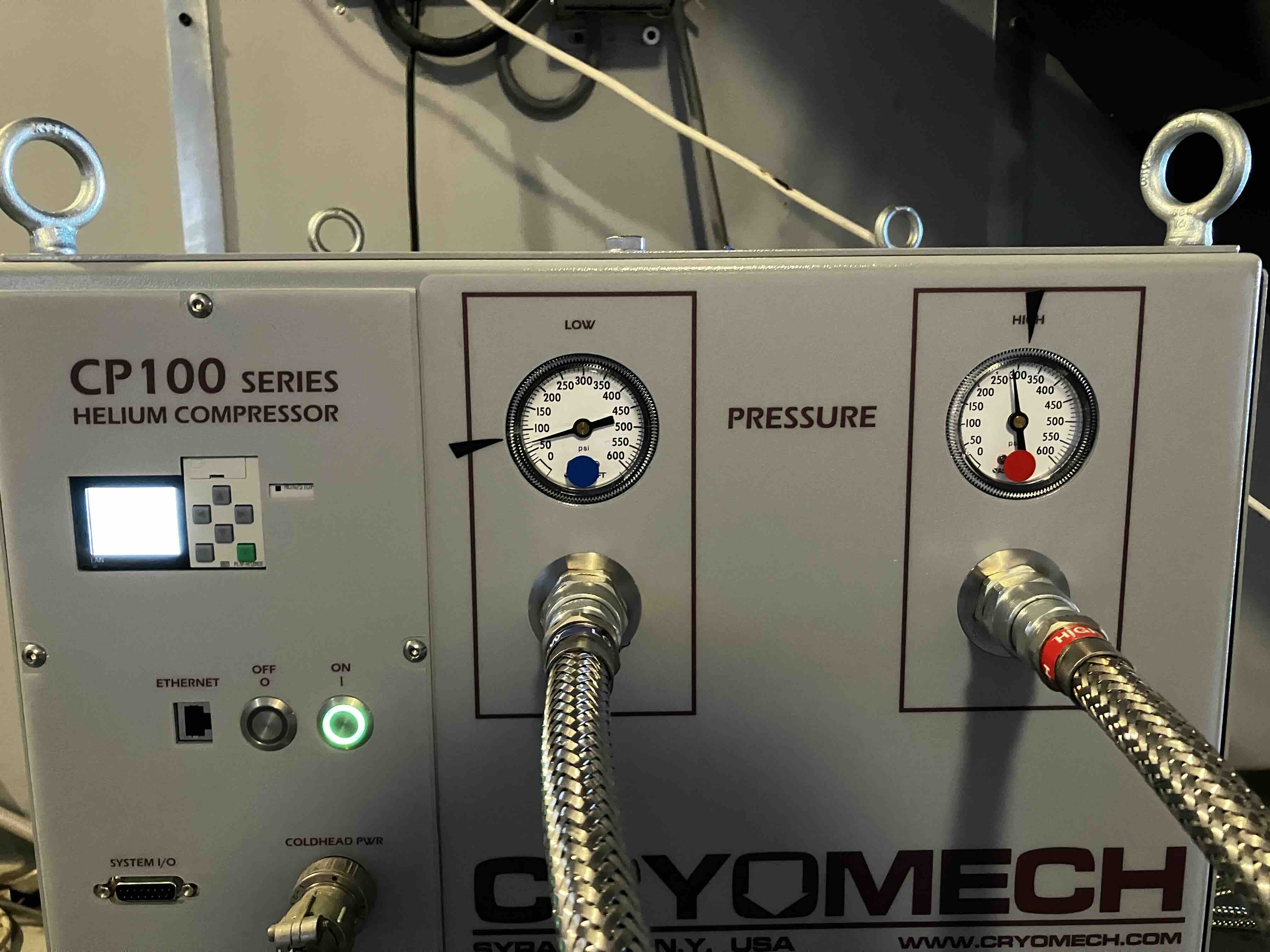 - Press ON on the compressors to begin pumping (start both compressors at the same time to lessen temperature gradients on the focal plate).