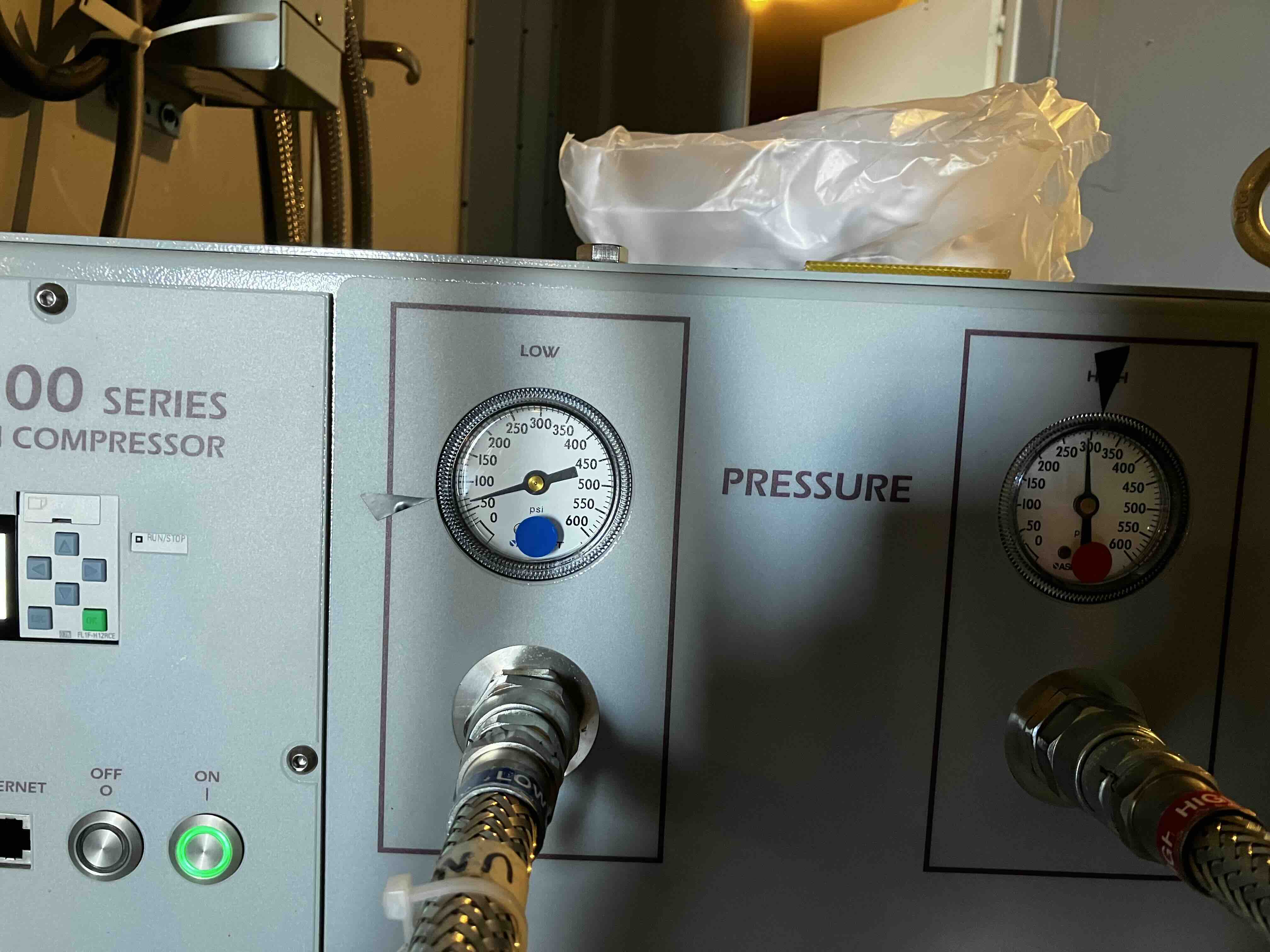 - Check that the Low and High pressure gauges on the compressors settle around their nominal levels, indicated by the black tape.